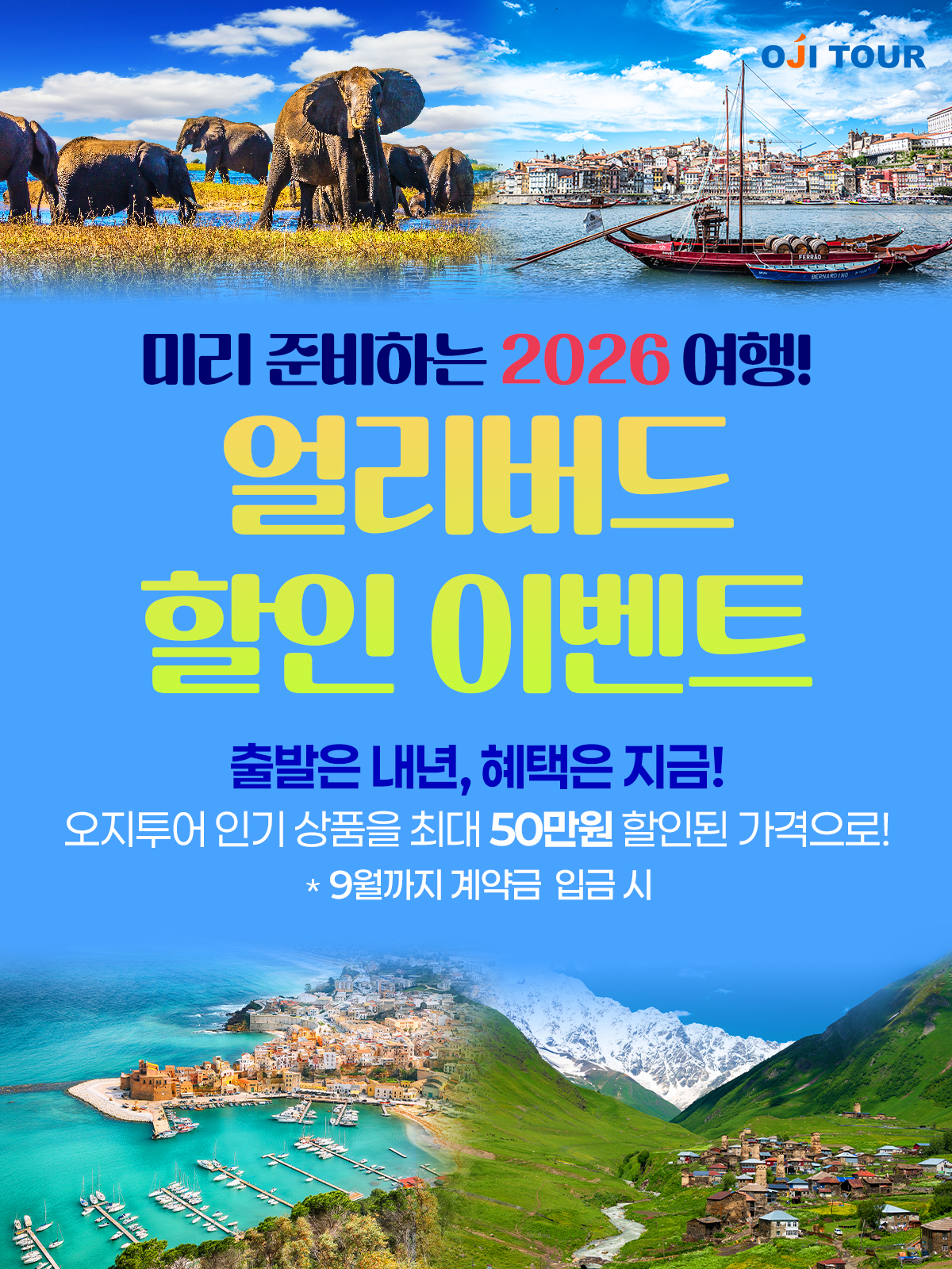 2026년 오지투어는 그 설렘을 한층 더 크게 느끼실 수 있도록, 최대 50만원 할인 혜택이 기다리는 얼리버드 이벤트를 준비했습니다.